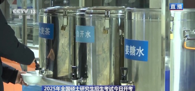 今天是冬至节气,天气非常寒冷,学校在室外每个等候区域都搭设了透明暖棚,里面安装了空调。另外,还为考生特别设置了早餐、午餐的专属就餐区以及休息区域。在校园里的很多区域还准备了姜糖水、大麦茶,供考生驱寒取暖。